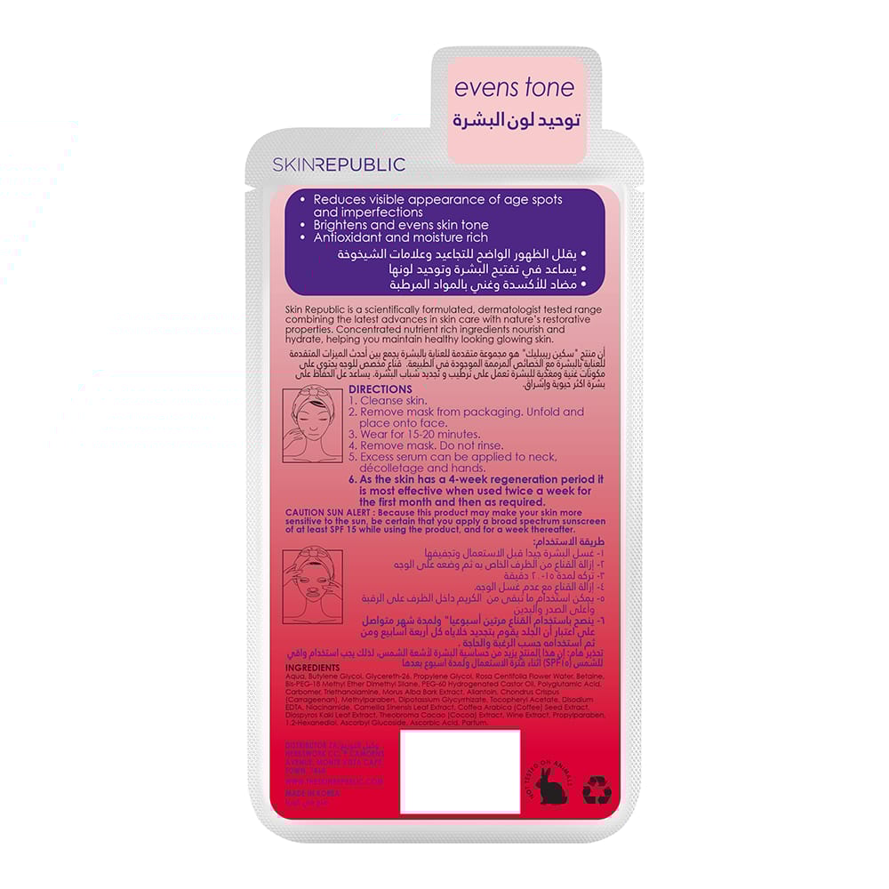 {"_id":"662e0c99617b326e8cb3833a","sku":"39375","brand":"SKIN REPUBLIC","name":"Brightening Vitamin C, Tone evening face mask","publish":"1","price":34.01,"seller":"5e5ba36356297b5dd7d7df93","approve":"approved","shippingTax":"default","unique_barcodes":[],"uniquesku":["39375"],"attributes":[{"name":"_brand","value":"SKIN REPUBLIC","_id":"69105918c654c2080dd32cbf"}],"available":true,"sort_order":0,"compare_price_discount":0,"compare_price_discount_pct":0,"images":[{"image":"662e0d1dfda15e69d71a5d91/8809313499004.png","caption":"","tags":""},{"image":"662e0d1dfda15e69d71a5d93/8809313499004-2.png","caption":"","tags":""},{"image":"662e0d1dfda15e69d71a5d95/8809313499004-3.jpg","caption":"","tags":""},{"image":"662e0d1dfda15e69d71a5d97/8809313499004-4.jpg","caption":"","tags":""},{"image":"662e0d1dfda15e69d71a5d99/8809313499004-5.jpg","caption":"","tags":""},{"image":"662e0d1dfda15e69d71a5d9b/8809313499004-6.jpg","caption":"","tags":""},{"image":"662e0d1dfda15e69d71a5d9d/8809313499004-7.jpg","caption":"","tags":""}],"media":[],"inventory_management":"automatic","dimension":{},"options":[],"SEO":{},"files":[],"location_availability_mode":"default","ondc":{},"google_shopping":{},"gift_card_options":{"type":"digital","valid_for":{}},"metafields":{"how_to_use":"Cleanse skin, remove mask from packaging, unfold and place on face, wear for 15-20 minutes, remove mask, do not rinse. Excess serum can be applied to neck, décolletage and hands.","ingredients":"Key Ingredients:\t\nVitamin C\nLiquorice\nCoffee Bean Extract","unitSAP":"EA","skin_tone":[],"lips":[],"kunooz_seo":{},"whites_seo":{}},"variants":[],"alias":"brightening-vitamin-c-tone-evening-face-mask","created_on":"2024-04-28T08:45:13.058Z","_created_by":"647ca77ccd69b4dec86358d8","categories":["skin-care","treatment-and-serum","mask-and-peels","skin","masks","masks-and-peels"],"default_variant":null,"description":"Reduces appearance of age spots and imperfections, Helps brighten and even skin tone, Antioxidant and moisture rich","inventory_management_level":"product","inventory_quantity":2,"kunooz_sort_order":1,"substore":["whites-express","kunooz","whites","store-whites","store-kunooz"],"tax":"5e7afbf58c3a1a400643f7c3","updated_on":"2025-11-09T09:04:25.023Z","whites_sort_order":975,"_updated_by":"647ca77ccd69b4dec86358d8","collections":["all-items-live-2024","non-medicine-2024","tiqmo","coupon2025","ksa-code","make-upandskin-care-25percent","schools-campaign","almatar-collection20","eid-box","labubu-free-gift","wh15","wh15s","nd95","arb","zahra","ncosh","kau"],"last_order_date":"2025-09-18T16:47:36.578Z","last_order_id":"OID360020","total_order_count":16,"total_sales_amount":464.89,"_size":740,"list_price":34.01,"our_price":34.01,"original_price":34.01,"discounts_total":0,"discounts_percentage":"0.000","discount_total":0,"original_sort_order":0,"entity_type":"ms.products","approved_prescription":"unapproved","featured_image":{"image":"662e0d1dfda15e69d71a5d91/8809313499004.png","caption":"","tags":""},"selected_options":{},"selected_variant":{},"category":{"_id":"5e7388fcf1087b20afaa3bc7","name":"Masks & Peels","alias":"masks-and-peels","publish":"1","parent":{"_id":"5e7388fcf1087b20afaa3bbf","name":"Masks","alias":"masks","publish":"1","parent":{"_id":"5e7388fbf1087b20afaa3b77","name":"Skin","alias":"skin","publish":"1","parent":null,"images":[],"SEO":{"sitemap_frequency":"","title":"تسوق منتجات العناية بالبشرة في الرياض | صيدلية كنوز","description":"اطلب أفضل منتجات البشرة (غسولات وكريمات مرطبة والمزيد) أونلاين من صيدليات كنوز في الرياض. ✅ توصيل 24 ساعة ✅ توصيل مجاني > 200 ريال."},"default_sort_order":"manually","metafields":{"EN":"60126241f524afb460f6c483/skin.jpg","AR":"6012623d4cbec4b4b12f2ae5/skin.jpg","_metadata":{"EN":{"name":"skin.jpg","type":"image/jpeg","size":10071,"_id":"60126241f524afb460f6c483"},"AR":{"name":"skin.jpg","type":"image/jpeg","size":10071,"_id":"6012623d4cbec4b4b12f2ae5"}},"whites":{},"kunooz":{"AR":"618b7ee6d1542c5e0cf41240/skin-care.jpg","EN":"618b7ed5b415597a0a91251e/skin-care-_-en.jpg","_metadata":{"AR":{"name":"skin care .jpg","type":"image/jpeg","size":836957,"_id":"618b7ee6d1542c5e0cf41240"},"EN":{"name":"Skin care _ En .jpg","type":"image/jpeg","size":885726,"_id":"618b7ed5b415597a0a91251e"}}},"whites-offers":{},"category_top_brands":[],"mobile_icon":"<svg class=\"svg-icon-skinCat\"><use xlink:href=\"#skinCat-svg-icon\"></use></svg>","top_picks":"1","kunooz_app":{"EN":"6034c3a87001d642bb325404/skin-eng.jpg","AR":"6034c3b0bb7cfa42728e08d7/skin-ara.jpg","_metadata":{"EN":{"name":"skin-eng.jpg","type":"image/jpeg","size":52905,"_id":"6034c3a87001d642bb325404"},"AR":{"name":"skin-ara.jpg","type":"image/jpeg","size":54454,"_id":"6034c3b0bb7cfa42728e08d7"}}},"kunooz_top_picks_image":{"EN":"60261f68c0a7c03fb4b84352/skin-new.jpg","_metadata":{"EN":{"name":"skin-new.jpg","type":"image/jpeg","size":15254,"_id":"60261f68c0a7c03fb4b84352"},"AR":{"name":"skin-new.jpg","type":"image/jpeg","size":15254,"_id":"60261f6b5dff944004f17118"}},"AR":"60261f6b5dff944004f17118/skin-new.jpg"},"kunooz_app_subcategory_banner":{},"whites_app":{},"whites_app_category":{},"whites_category_top_brands":[],"kunooz_desktop_menu_img":{},"kunooz_desktop_cat_page_img":{},"kunooz_desktop_cat_round_img":{"EN":"61794ef9551a0048e4eaa973/category-photos-01.png","AR":"61794efe551a0048e4eaaa0c/category-photos-01.png","_metadata":{"EN":{"name":"category photos-01.png","type":"image/png","size":272232,"_id":"61794ef9551a0048e4eaa973"},"AR":{"name":"category photos-01.png","type":"image/png","size":272232,"_id":"61794efe551a0048e4eaaa0c"}}},"kunooz_desk_subcategory_banner":{},"kunooz_desktop":{"EN":"618a42d1530fcaaa2cc92229/skin-care-_-en.jpg","AR":"618a42d8ab1746aae01464a5/skin-care.jpg","_metadata":{"AR":{"name":"skin care .jpg","type":"image/jpeg","size":836957,"_id":"618a42d8ab1746aae01464a5"},"EN":{"name":"S