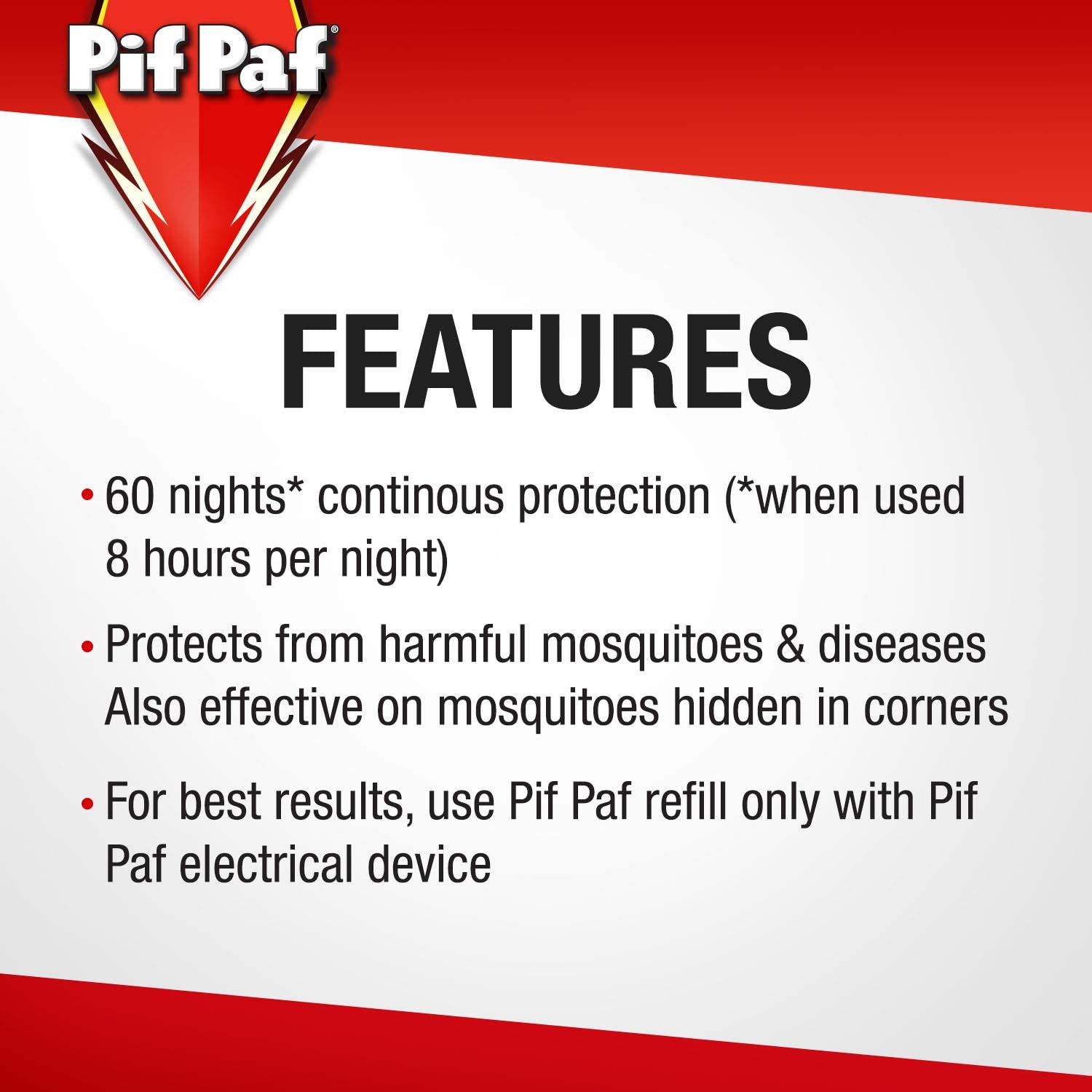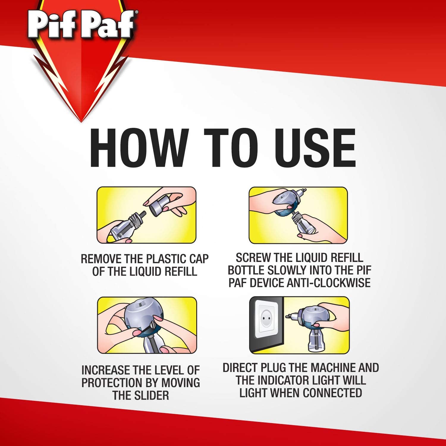 Pif paf liquid mosquito killer provides 100% protection against mosquitoes all night long. This ultimate value pack consists of a kit inch a 30 night refill and a extra 60 night refill. Formulated with active ingredients, pif paf is a powerful and convenient solution to offset mosquitoes and serve as the first line of defence against potential diseases and health hazards. The device starts working typically 5 min after plugged in. On top, the device has a superior heating system that ensures low electricity consumption and the dual-mode machine with high and low-intensity modes, make sure you and your family stay protected always. Liquid vaporiser bottle shall last for 30 nights in approved use of 8 hours per night. How to use: 1. Remove the plastic cap of the liquid refill. 2. Screw the liquid refill bottle slowly into the pif paf device anti-clockwise. 3. Increase the level of protection by moving the slider. 4. Direct plug the machine and the indicator light will light when connected.