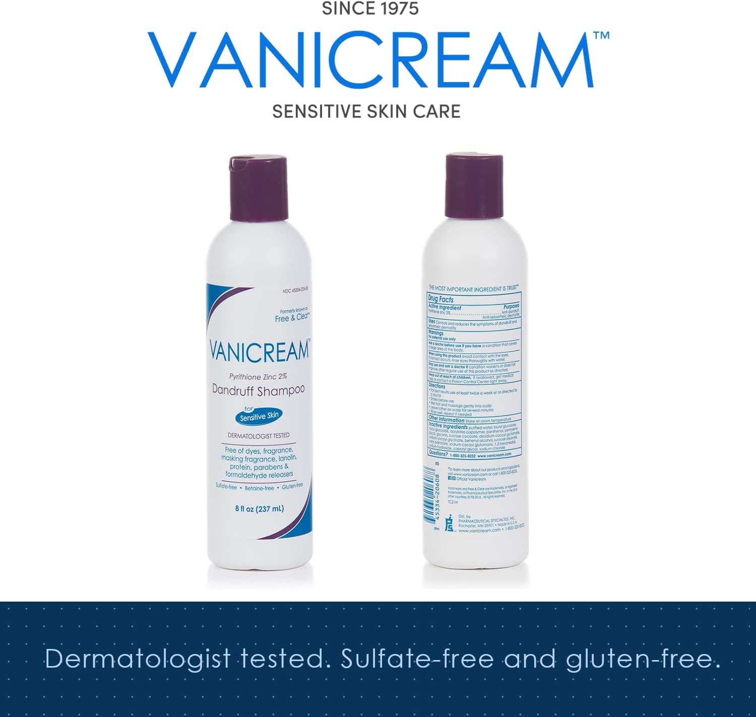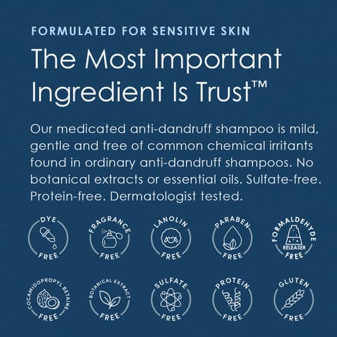 Product description Maximum OTC strength, Vanicream Medicated Dandruff Shampoo helps relieve itching, irritation, redness, flaking and scaling associated with dandruff and seborrheic dermatitis. Mild and gentle for those who need, or want, a dandruff shampoo that is free of common chemical irritants. pH balanced. For all hair types. From the makers of Vanicream Sensitive Skin Care. Formerly Free & Clear AntiDandruff Shampoo; same great product with a new name.